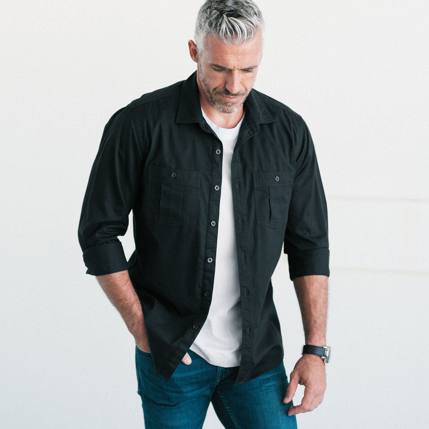 This Craftsman Utility Shirt is equipped with reinforced seams and utility pockets, delivering a masculine, laid-back aesthetic. Its spread collar and tailored cut exude a timeless style, perfect for pairing with medium blue jeans and sneakers for a classic ensemble.